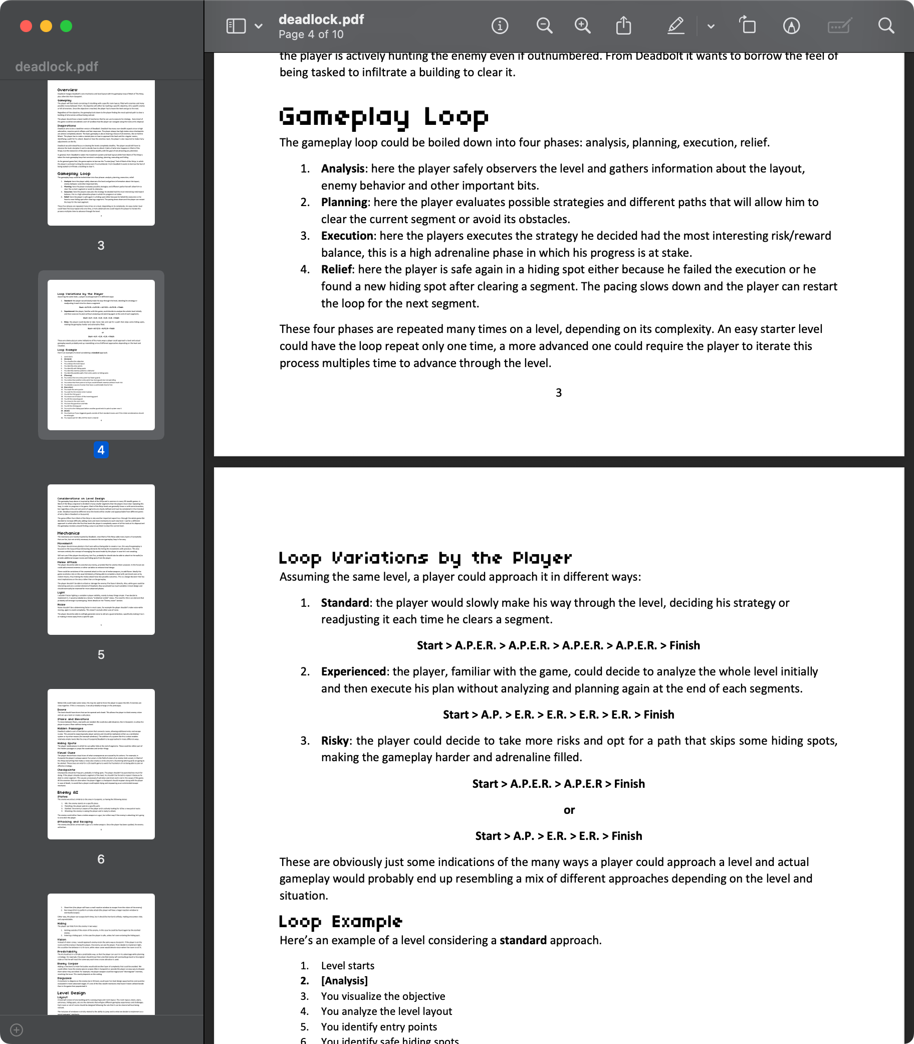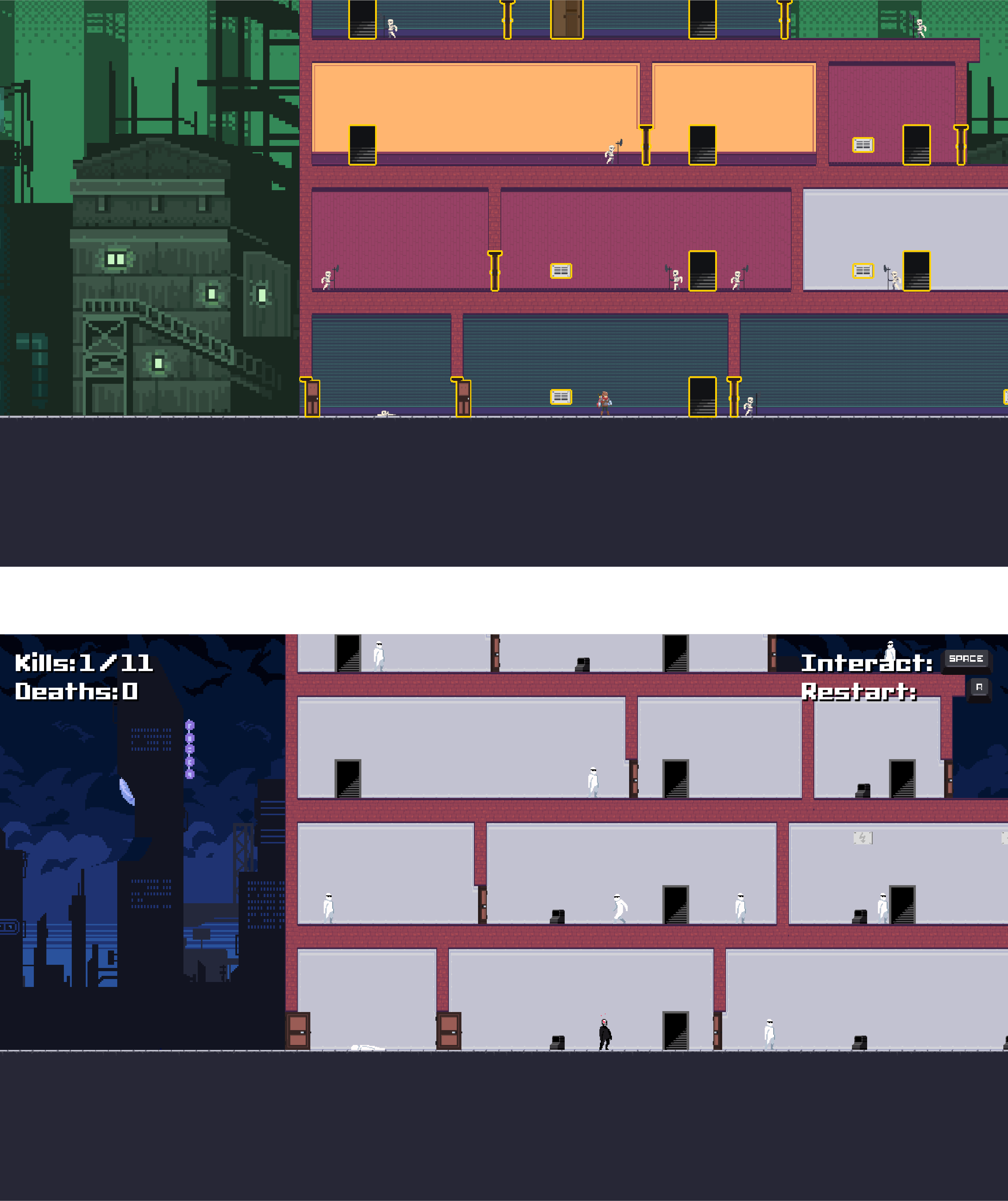 The biggest inspiration for this game is fore sure Gunpoint and Deadbolt. Especially when it comes to the level layout. From a game design perspective it’s a very interesting layout that is not very used (if anyone knows of other games that use it, please let me know!). When I was playing both games, I realized that it would be a very good level layout for a 2D stealth game, so I started to think about it and eventually translated my thoughts and my ideas on a Game Design Document detailing how my “dream” 2D stealth game would look like.